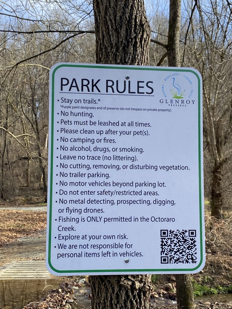Park Rules are clearly displayed in several locations, both at the parking lot and at the beginning of the trail as well as a doggy bag station. The QR code is a really nice touch! P.S. I had cell service throughout both sides of the preserve.
